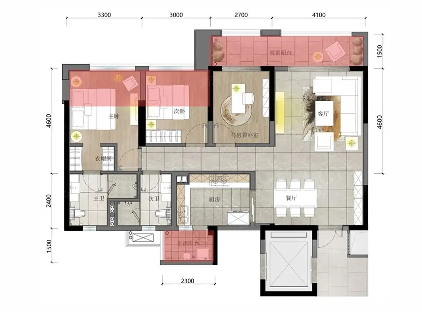 • 卧室优化: 主卧床位避免正对房门/卫生间,床头靠实墙;次卧床位首选东南角(文昌)。